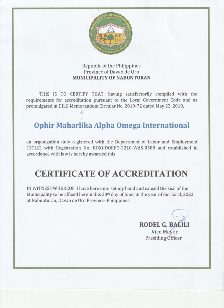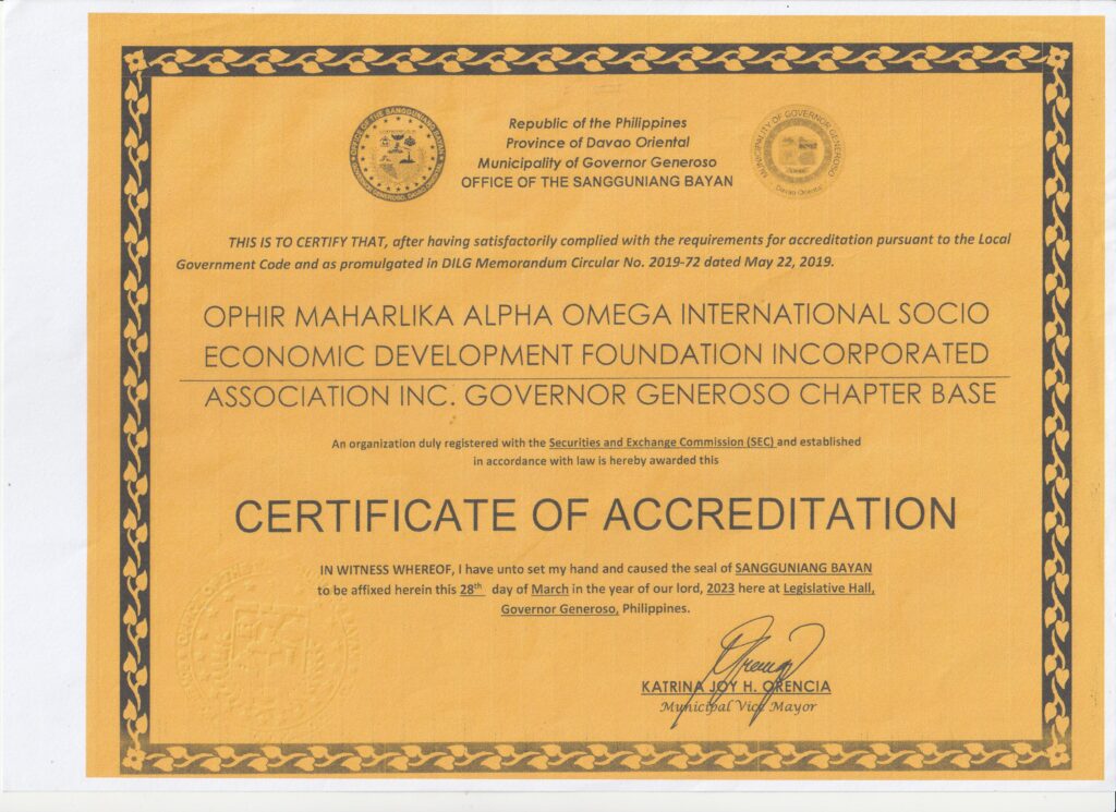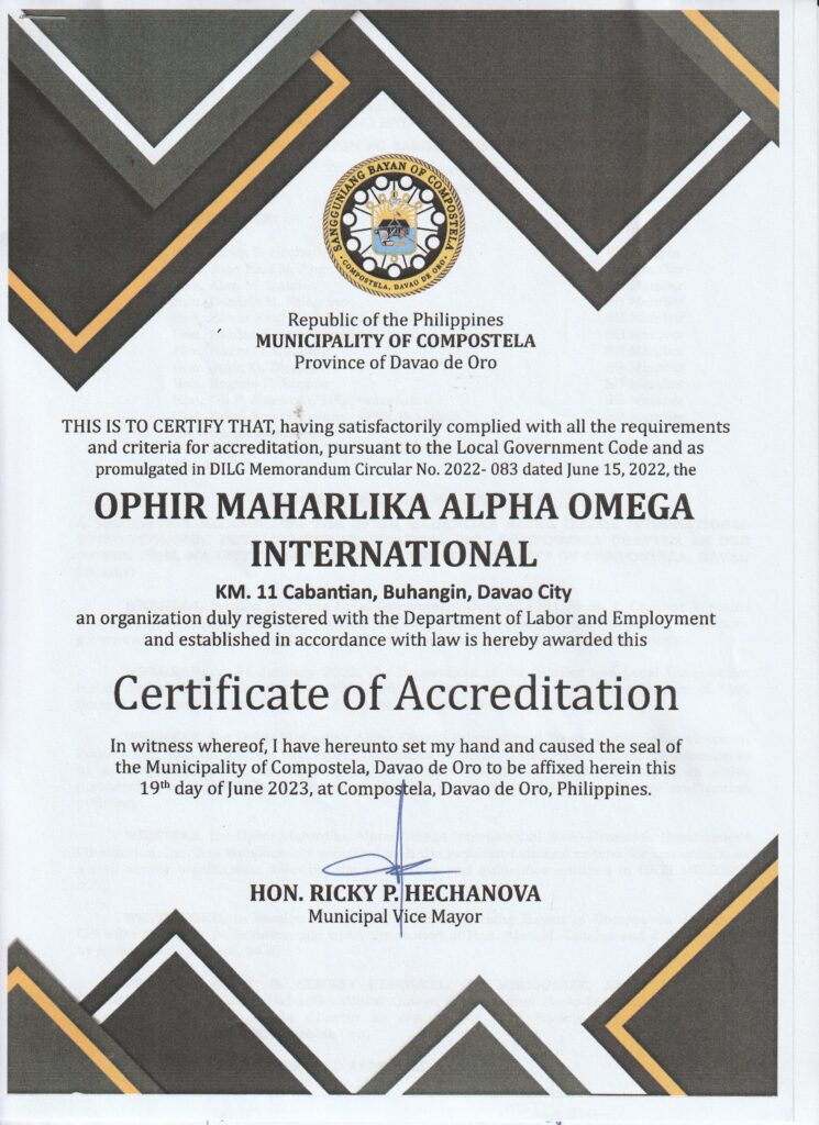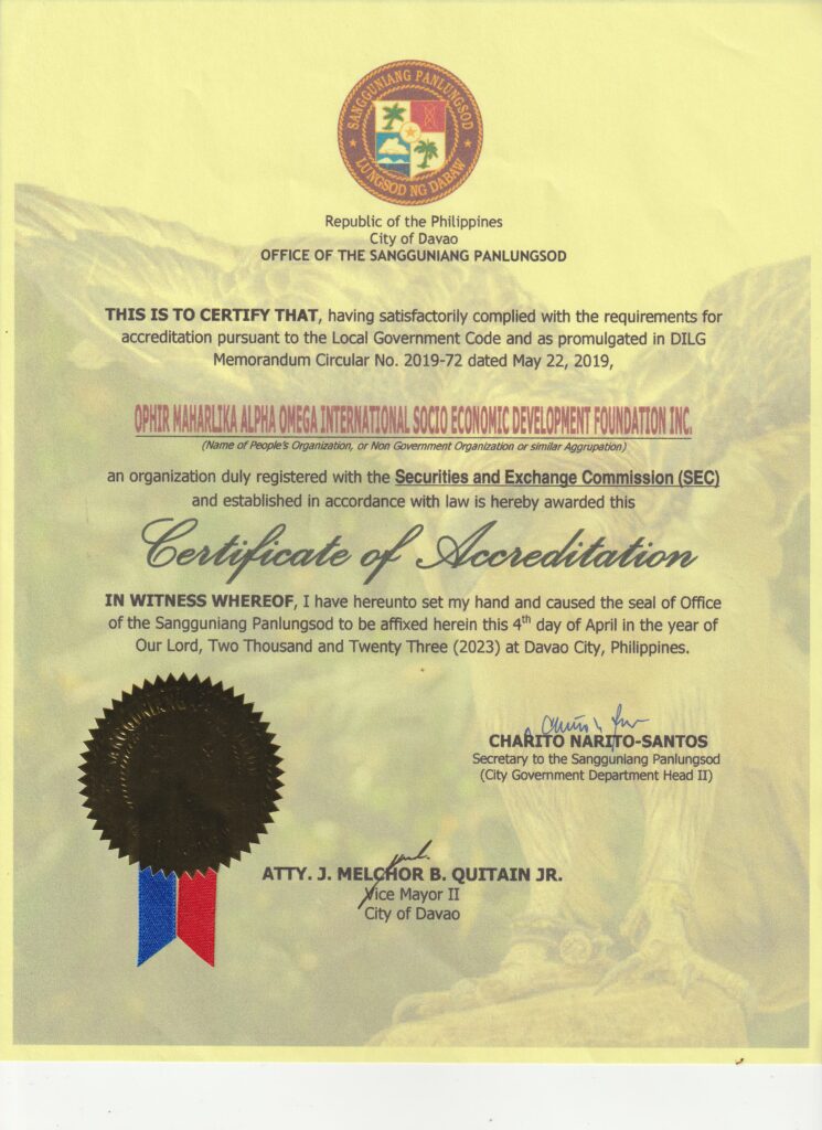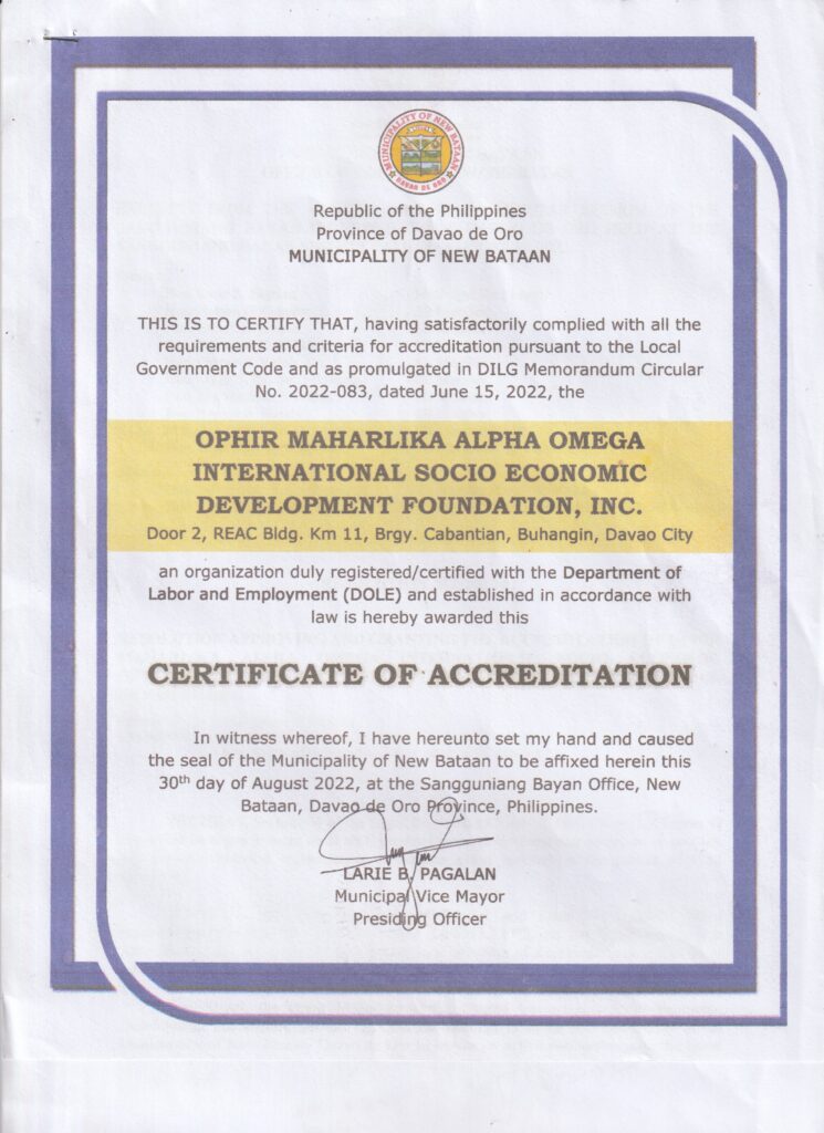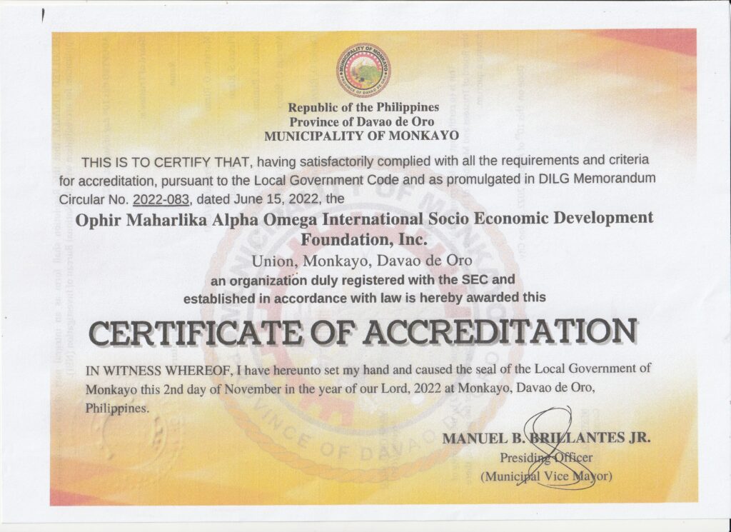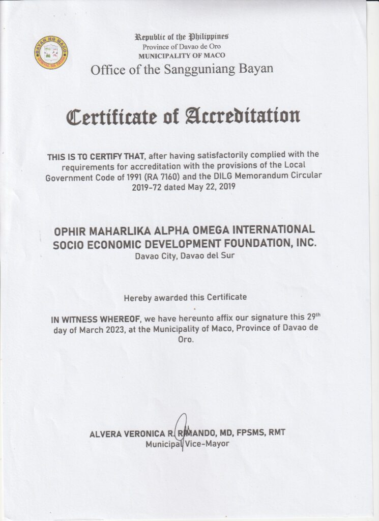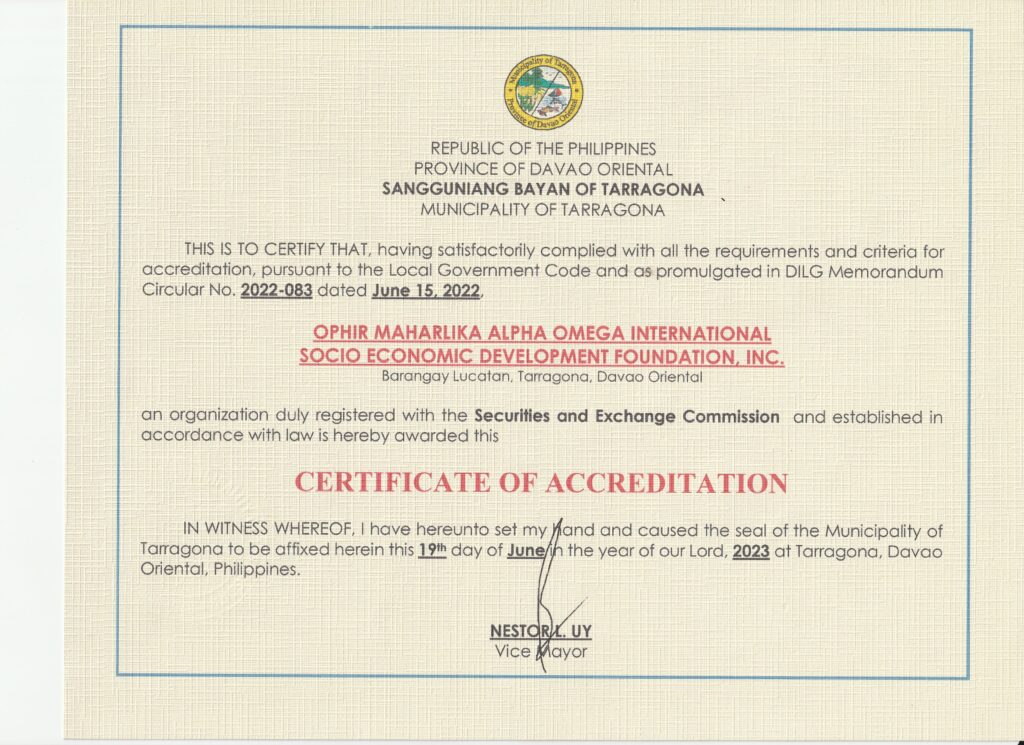 Ophir Maharlika Alpha Omega International has received Certificates of Accreditation under the Local Government Code of the Philippines, recognizing its commitment to empowering communities, promoting sustainable development, and fostering participatory governance. The organization's accreditation signifies its adherence to transparency, accountability, and good governance principles, establishing it as a trusted partner for local government units (LGUs) and facilitating collaboration for the betterment of marginalized communities. This achievement highlights Ophir Maharlika Alpha Omega International's leadership, efforts, and significant impact in driving positive change. The organization's ongoing dedication to sustainable development continues to inspire, and we look forward to witnessing its continued transformative contributions to communities across the Philippines.